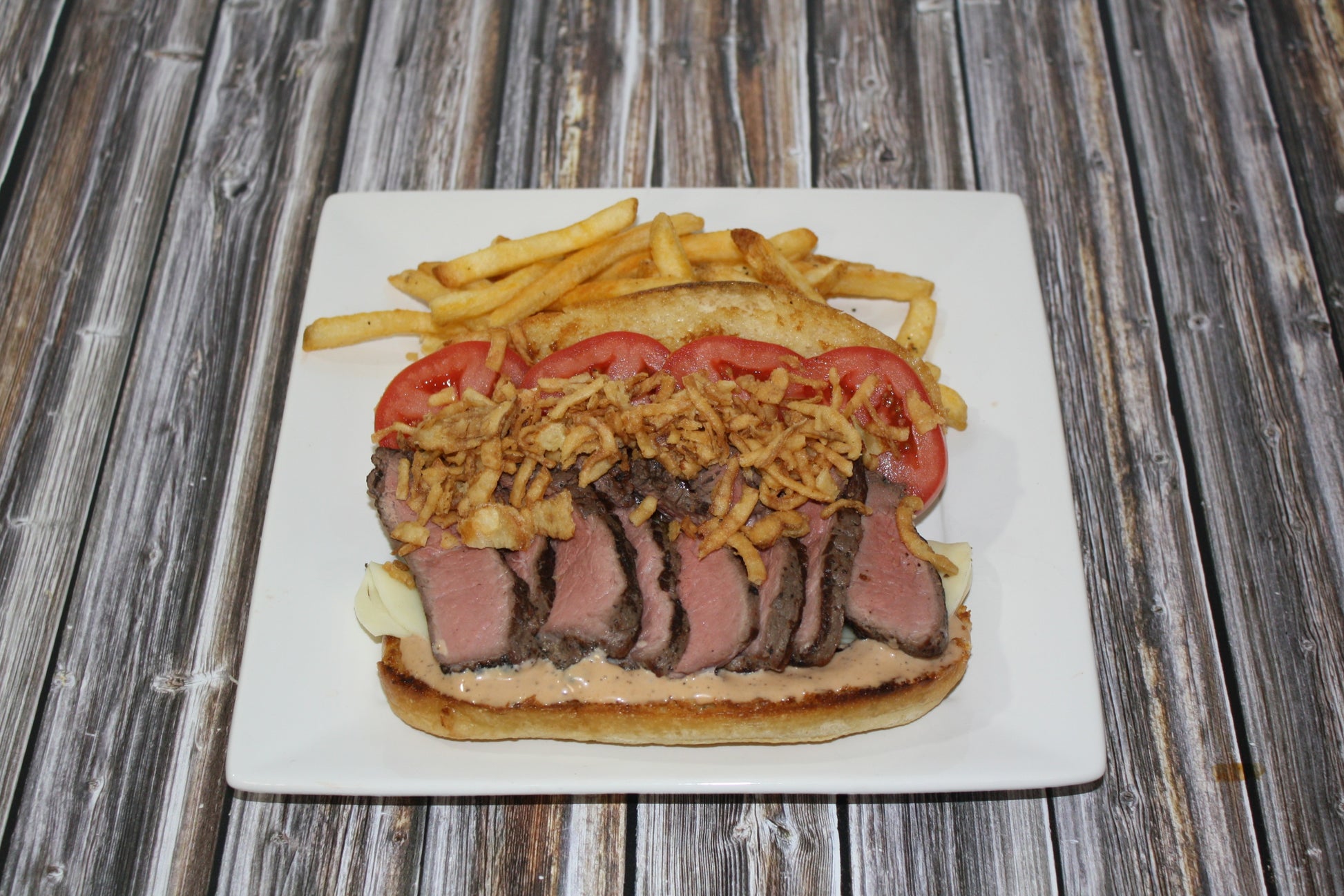 These BBQ Spice Sirloin Steak Sandwiches are a hearty, comfort-packed favorite layered with tender, seasoned sirloin steak, melted provolone cheese, and fresh tomato slices, all tucked into warm, buttery sesame hoagie rolls. Finished with creamy BBQ spice mayo and crispy fried onions for the perfect crunch, each sandwich delivers a rich, smoky flavor with every bite. Served alongside crispy shoestring fries, this satisfying meal is perfect for an easy, filling dinner the whole family will enjoy.