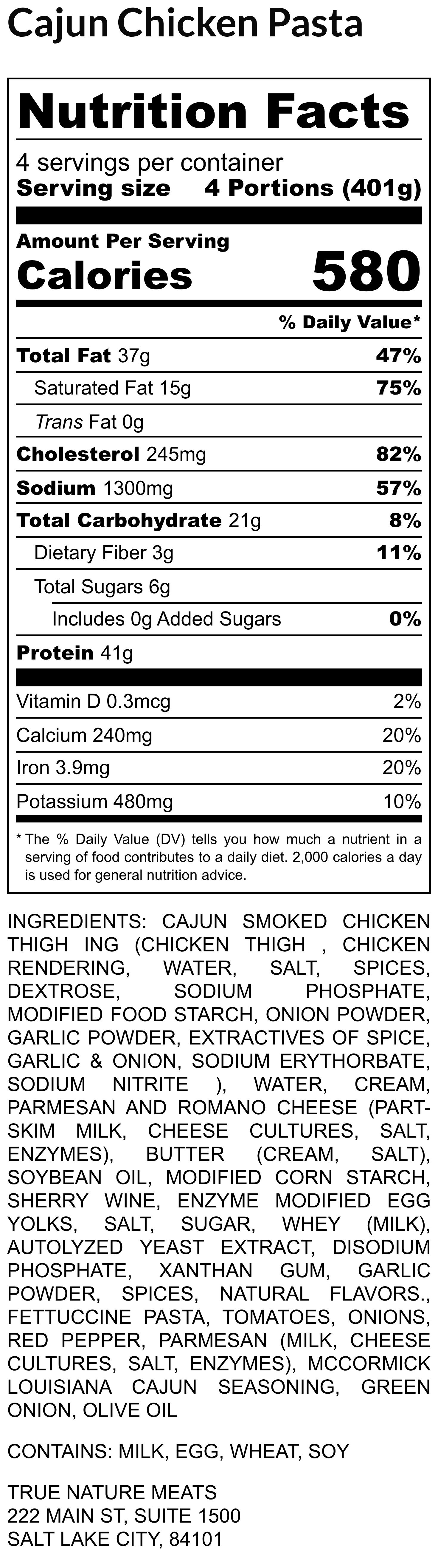 Delicious Cajun Smoked Chicken Fettuccine with creamy Alfredo sauce, Parmesan cheese, fresh tomatoes, onions, peppers, and green onions. Serves 4. Contains milk, egg, wheat, soy, and sulfites. Easy to prepare and perfect for a flavorful meal.