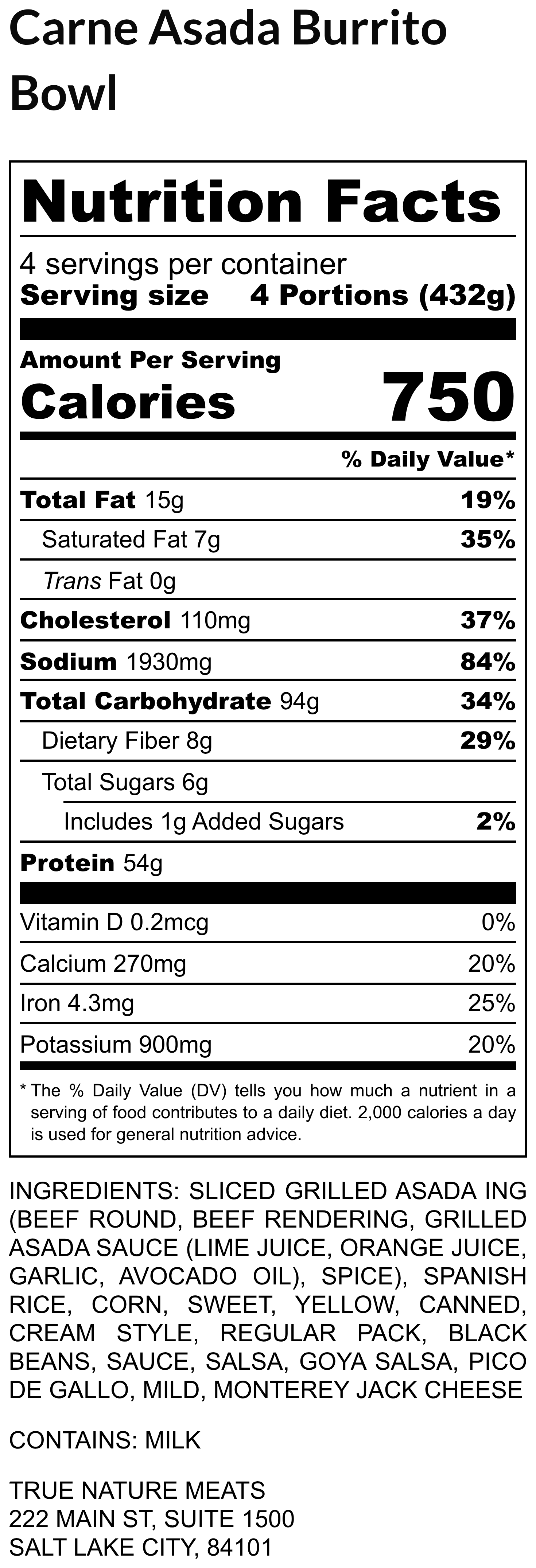 Carne Asada Burrito Bowl with sliced grilled beef, Spanish rice, black beans, corn, Monterey Jack cheese, and Pico de Gallo. Serves 4. Contains milk.