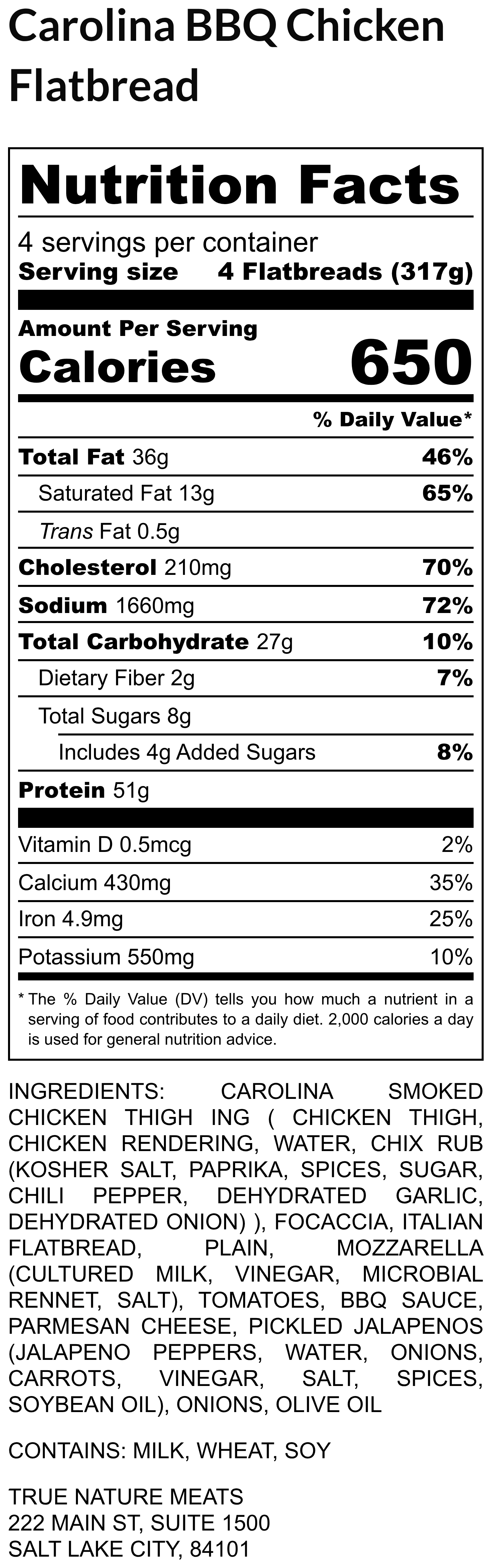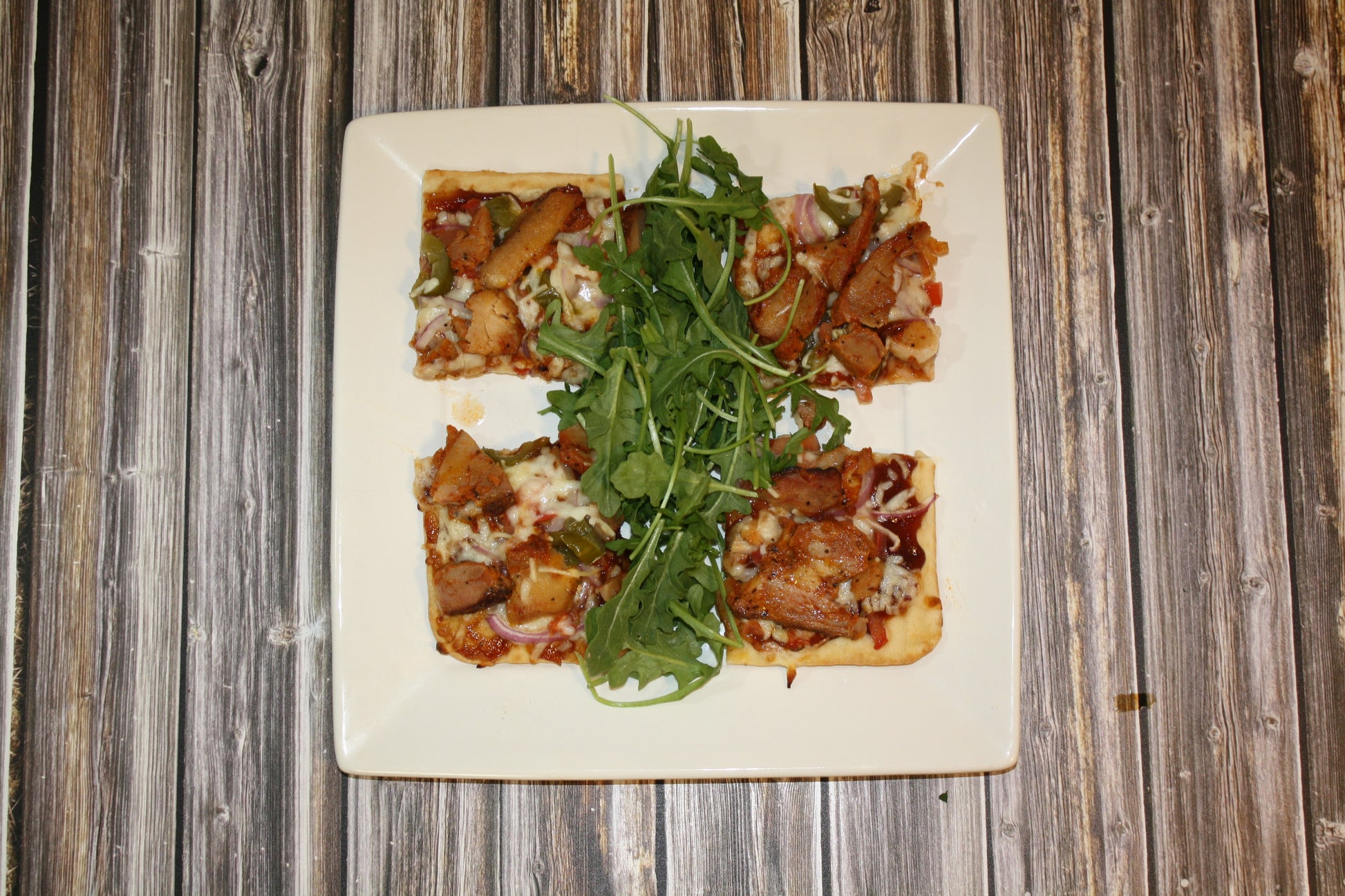 Carolina BBQ Chicken Flatbread with shredded smoked chicken, BBQ sauce, mozzarella, parmesan, tomatoes, onions, and jalapenos. Serves 4. Contains milk, wheat, soy.