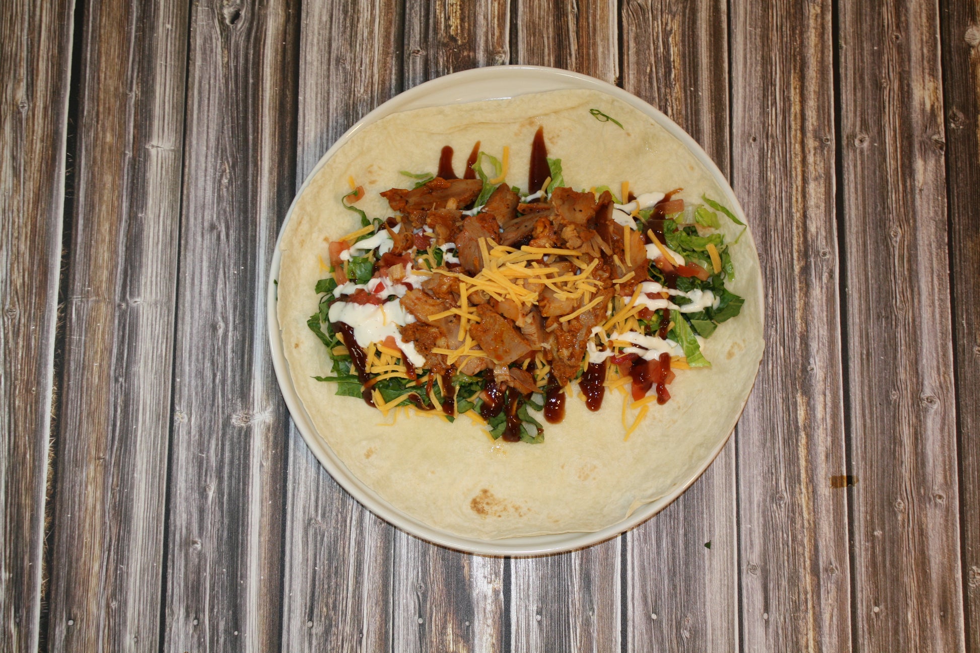 Carolina BBQ Chicken Wraps with shredded smoked chicken, BBQ sauce, ranch dressing, cheddar cheese, lettuce, and tomatoes in flour tortillas. Serves 4. Contains milk, egg, wheat, soy.