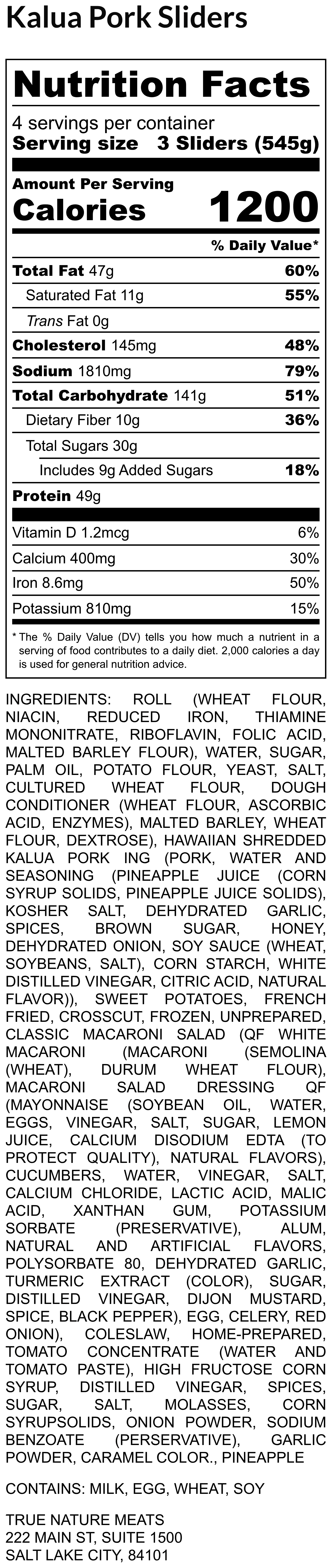 Treat yourself to Kalua Pork Sliders, a mix of juicy shredded pork, pineapple slaw, and BBQ sauce on Hawaiian rolls, served alongside sweet potato fries and classic macaroni salad.