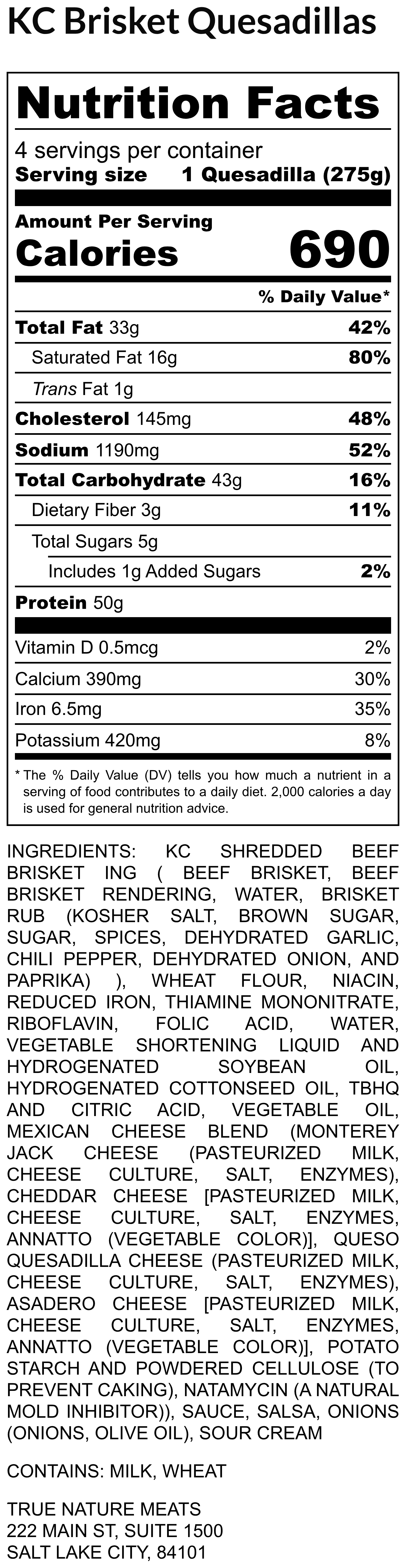 Enjoy cheesy goodness with KC Brisket Quesadillas featuring juicy smoked brisket, sautéed onions, and a side of salsa and sour cream. Great for lunch, dinner, or snack time!