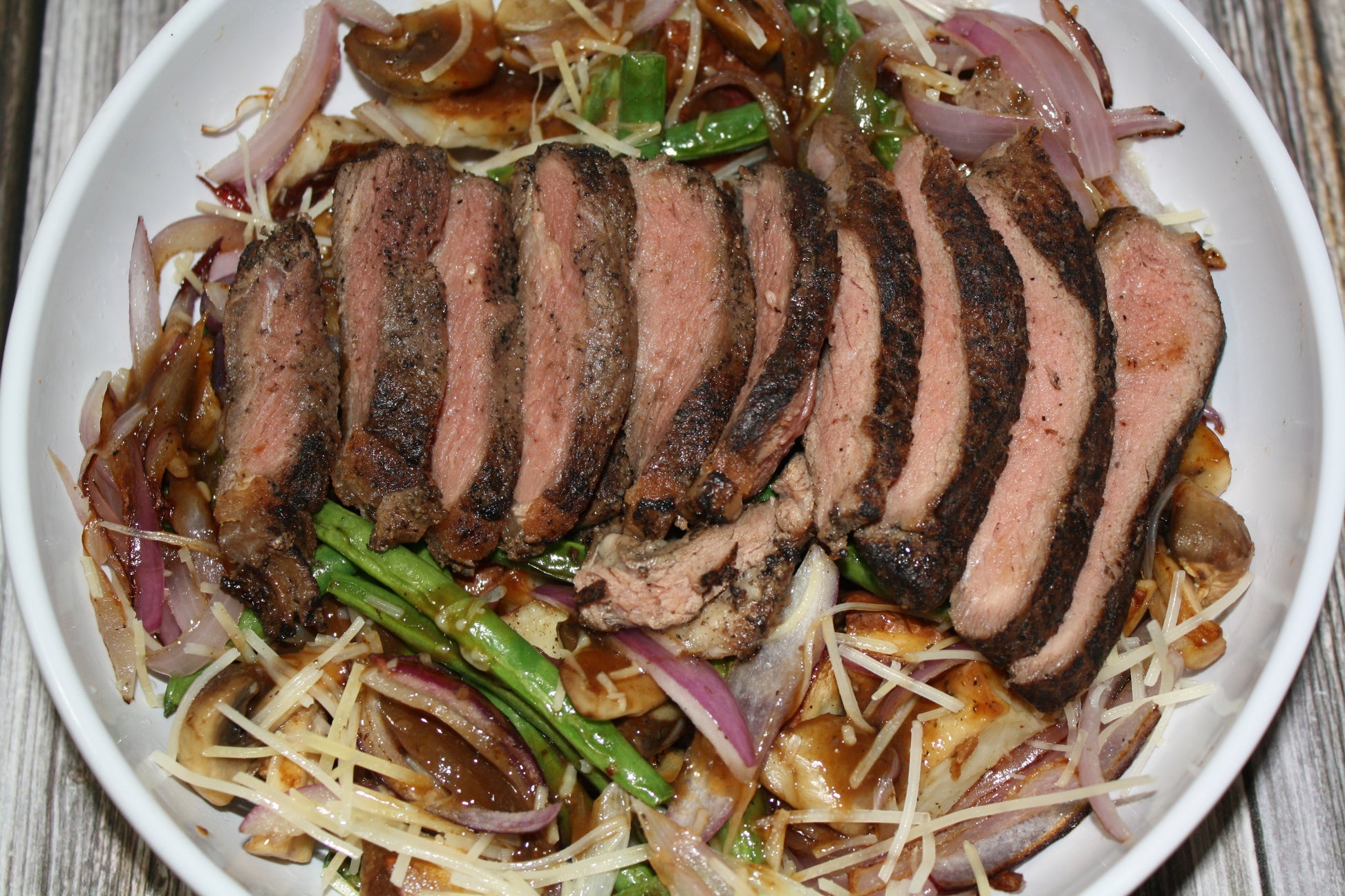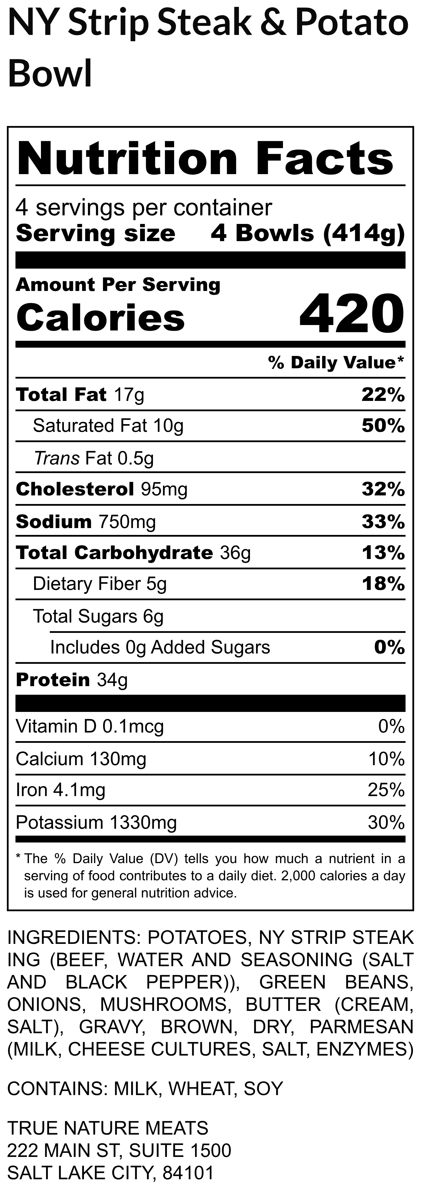 Enjoy a hearty NY Strip Steak & Potato Bowl featuring juicy steak, roasted potatoes, fresh green beans, mushrooms, and parmesan cheese, topped with savory gravy.