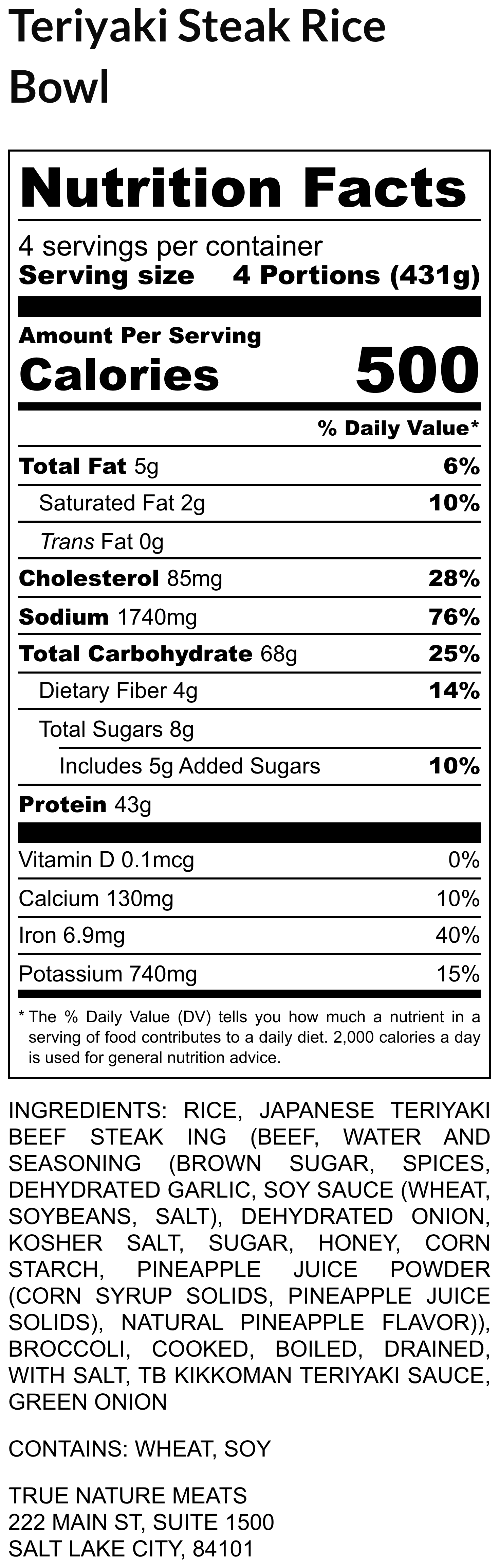 Teriyaki Steak Rice Bowl featuring Japanese teriyaki beef, steamed white rice, broccoli, and Kikkoman teriyaki sauce. A hearty, ready-to-serve meal for 4. Contains wheat and soy.